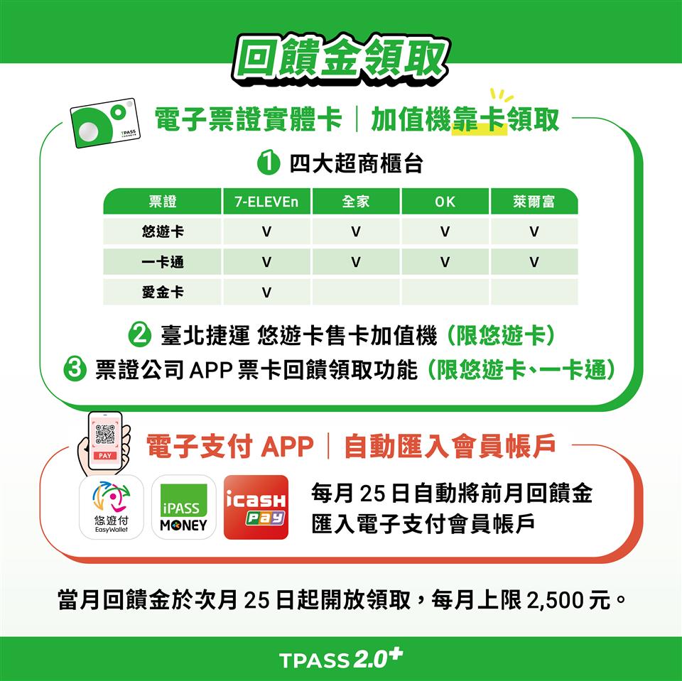 TPASS 2.0+公共運輸常客優惠回饋(114年12月1日起再升級) 瀏覽人數: 10人 自114年12月1日起,為照顧搭乘國道客運返鄉遠行需求,交通部公路局再升級推出TPASS 2.0+ 公共運輸常客優惠方案,每月搭乘91條中長途國道客運路線(西部70公里以上及東部國道客運路線)2次可享15%乘車金額回饋、搭乘4次可享30%乘車金額回饋,其他公共運輸則仍依既有回饋條件計算回饋金額。本次同步開放電子支付(悠遊付、iPASS MONEY、icash pay)納入累計回饋,民眾可自即日起,於常用的票證公司APP點選登錄成為TPASS 2.0+常客優惠會員,並於12月起且完成登錄次日起開始累計當月搭乘公共運輸紀錄,次月25日就可收到票證公司自動匯入回饋金至電子支付帳戶。詳情請至以下交通部公路局TPASS 2.0專屬網頁查詢(https://tpass.thb.gov.tw/)。